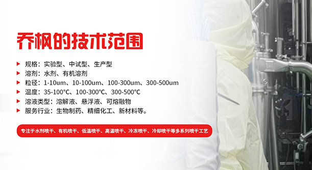 上海喬楓實業有限公司,成立于2012年,是從事粉體噴霧干燥機設備的研發、生產、銷售(小型噴霧干燥機,實驗型噴霧干燥機,氣流噴霧干燥機,有機溶劑噴霧干燥機,低溫噴霧干燥機,低溫閉式循環噴霧干燥機、噴霧造粒干燥機,離心噴霧干燥機,壓力噴霧干燥機,中藥浸膏噴霧干燥機,沸騰制粒機等)和售后于一體的綜合性公司,本公司現成為一家致力于為新能源材料、精細化工、生物制藥以及食品工程等領域提供全套解決方案的整線交鑰匙工程企業。